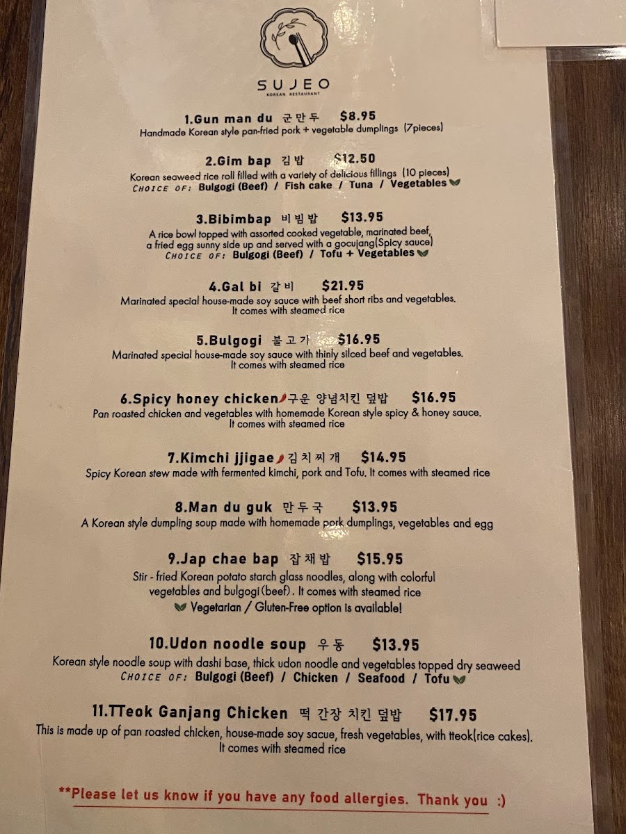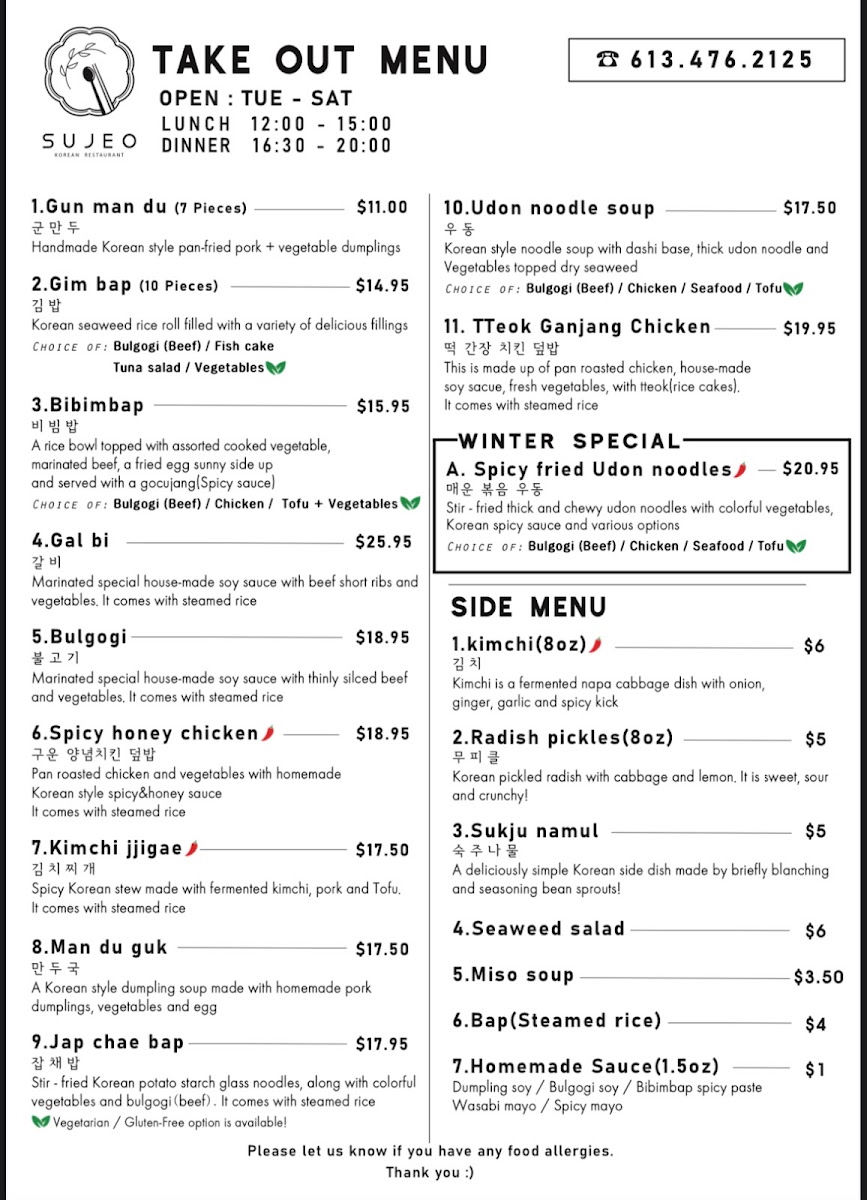 Welcome to SUJEO Korean Restaurant, a delightful gem nestled in Prince Edward, Ontario. This cozy eatery embraces the rich flavors of Korean cuisine, where each dish is prepared with authenticity and care. Guests rave about standout items like bulgogi, spicy honey chicken, and the comforting kimchi jjigae, all delivered with vibrant, homestyle seasoning.